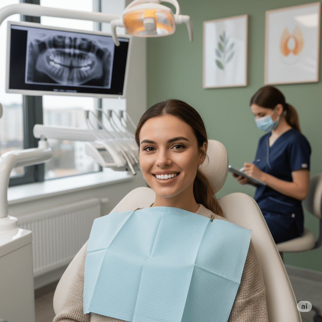 Огляд зубів українським стоматологом у Варшаві, спокійна атмосфера прийому.